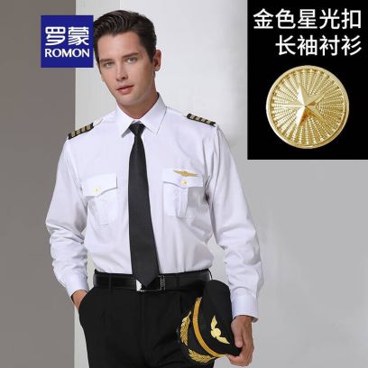 罗蒙(ROMON)飞行员空少白衬衫男机长制服空乘物业保安工作服衬衣夏装长袖套装 金色星光扣长*袖单件衬衫无配饰 43, 金色星光扣长*袖单件衬衫无配饰