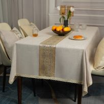 梦中情人中式桌布防水轻奢高级感长方形餐桌台布欧式高档布艺茶几布餐桌布 索丽德镶织带桌布麻灰色 137*200cm(适合1.4-1.5米长桌), 索丽德镶织带桌布蓝灰色