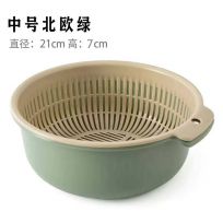 茶花谷双层沥水篮洗菜盆水果盘厨房客厅家用圆形淘菜篮子简约塑料收纳框 中号军绿2件套, 中号军绿2件套